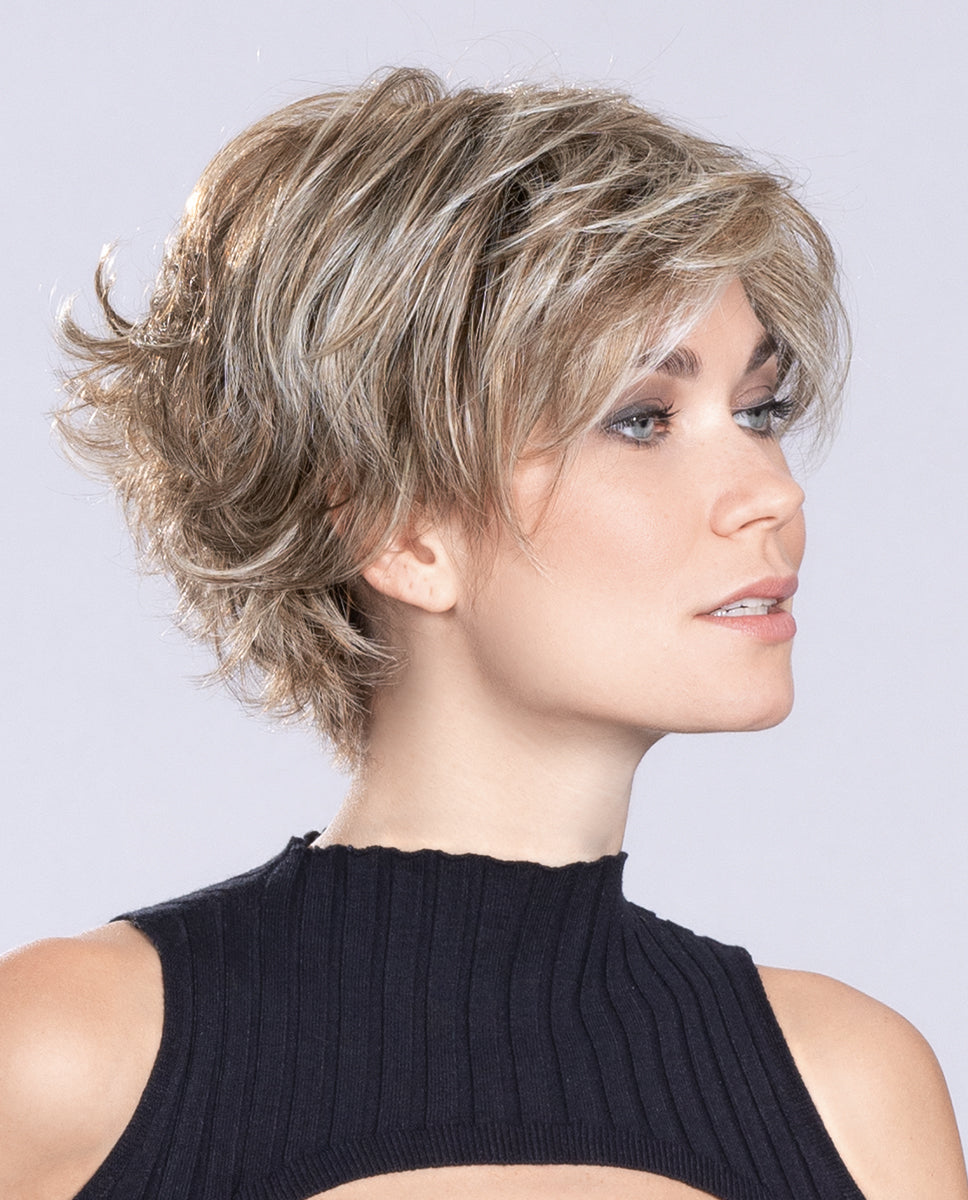 The Relax Large wig is a stylish and trendy wig made for large wig sizes designed with short shaggy layers that offer a fun and playful look. It is made from heat-friendly synthetic fiber that can be styled with heat tools like curling irons or straighteners to create different looks. The wig features a lace front that gives a natural-looking hairline and a mono crown that creates the illusion of natural hair growth at the crown area. The lace front also allows for easy and comfortable wearing, while the mono crown ensures that the wig looks realistic from any angle. The Relax wig is available in a range of stunning color options to suit any skin tone and personal style. Whether you're looking for a bold and bright color or a more natural shade, there is a color option to suit your needs. The feathered look of the wig gives it a light and airy feel, making it perfect for everyday wear or special occasions.